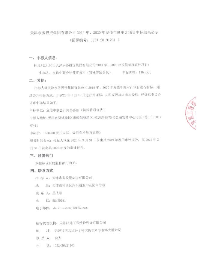 天津水務(wù)投資集團(tuán)有限公司2019年、2020年發(fā)債年度審計(jì)項(xiàng)目-中標(biāo)結(jié)果公示