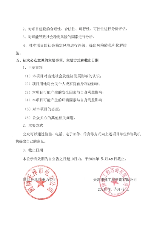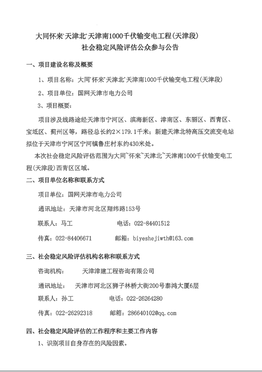 大同~懷來~天津北~天津南1000千伏輸變電工程(天津西青段)社會(huì)穩(wěn)定風(fēng)險(xiǎn)評(píng)估項(xiàng)目-公眾參與公告